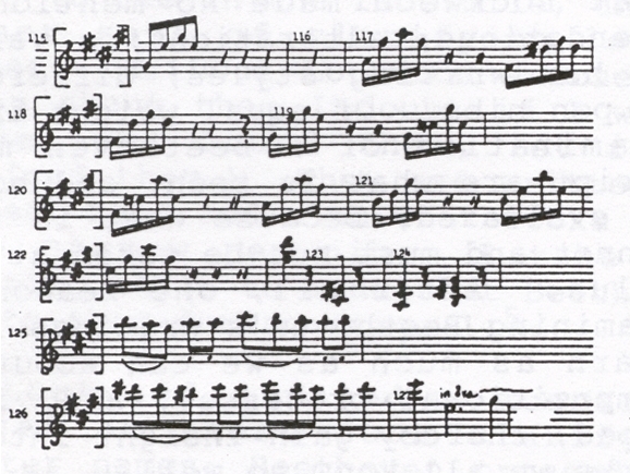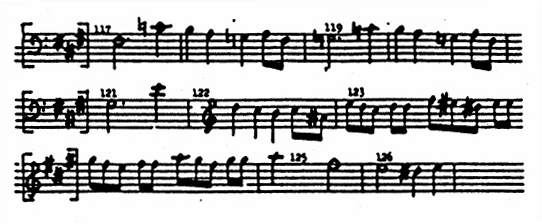 As for the l.h., even at Stage 1, the notes, rhythmic organization and format were identical to the printed version, with one exception: the octave placement. From the fourth beat of m. 115 to the first beat of m. 123 everything was up one octave. (Example 5). The l.h. in the entire E minor passage was not altered at Stage 1, except for m. 122, which was subjected to several revisions, in all three lines, r.h., l.h., and cello. M. 122 seems to have been a thorn in Beethoven's side, because he scratched out that one bar more times than any other (space doesn't permit a reconstruction of the various Stages of compositional creativity and development that went on in that one bar). The octave placement wasn't altered during Stage 2, so the change in octave placement occurred most likely in the fair copy.