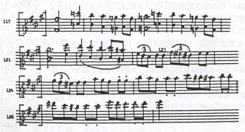 Lockwood derived the contents of his Example 6a from what is within the staff assigned to the r.h. But the matter of these 16th notes isn't a cut-and-dried matter. Beethoven needed many, many changes and alterations during Stage 1, using what looks to me like a narrow pen nib. Stage 2 consisted of a major recasting of parts: the r.h. and cello lines were switched. Beethoven took what is in Example 2, assigned it to the r.h., and reset mm. 117-122 in octaves. (Example 3) He left the rhythmic pattern of mm. 123-126 intact, the same as in Example 2. The diminution to 16th notes, plus changing the rhythmic format of most of mm. 123-126 to what is in the printed version are examples of changes that took place later on, probably in the fair copy. On the other hand, when he then reassigned what is shown in Example 1 here, and gave it to the cello, Beethoven immediately altered the configuration of the 16th notes -- with two exceptions -- so that the revision in the autograph is what it is in the printed version. The two exceptions are: 1) there are no slurs, and 2) the notes of mm. 118 and 122, are different. While it might look as if Beethoven may have intended the 16th notes to be played with separate bows, we mustn't take the absence of slurs at face value. Some other slurs, elsewhere in the autograph, are not to be found in the printed version; there are also slurs in the autograph that are in the printed version. If Beethoven added slurs, he did so later on, in the fair copy. Example 4 shows what was in mm. 118 and 122; the pitches of these two bars were probably changed in the fair copy.