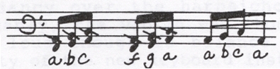 2. A correctional device Beethoven used in many other manuscripts can be found at Stage 1 -- clarifying letter names. They are used for several types of problems. Beethoven might have crossed something out, wrote in new notes, then changed his mind, deciding he wanted what he first wrote. In another instance, he would rework a group of notes, superimposing new notes directly on top of older ones. Also, there are cases where he'd add more notes to the original group and thus change the rhythmic format. Examples are shown here:
