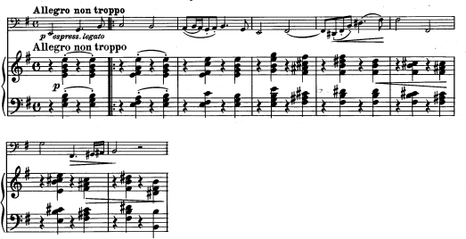 Fundamentally, my concept of the work is unchanged, but my understanding has grown in depth. I still feel that one of the crucial elements of this whole movement is the opposition of the piano to the cello and the atmosphere of tension and passion that pervades. The cello plays the first note; then the piano plays (see Example 2). It's almost as if the cello and piano are arguing the whole time, including when the cello plays the second theme (see Example 3). They continue to alternate with this kind of insistence as the music builds and builds, with the cello going higher and higher. The second theme sounds as if the cello is trying a different tack in order to get the piano to play with it, trying to convince the piano that "we have to play together." Then the cello reaches the top C and descends on its own (see Example 4). Now the piano takes over the melody, but this time it's the cello that's not playing with the piano, playing triplets against the piano's duplets (see Example 5). What a remarkable way of creating a piece of music! The two instruments, which one would think of as being at One with each other, are actually at odds with each other so much of the time. It's not until much further on that they finally agree to play together, and what a glorious moment! (See Example 6).