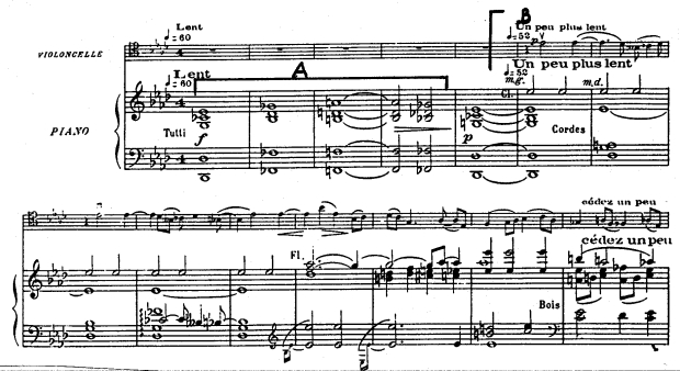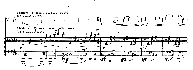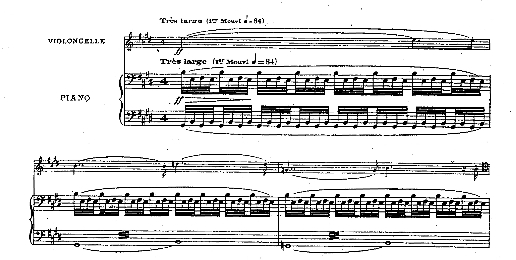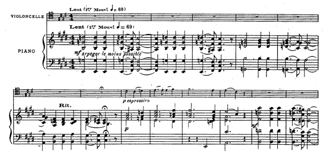 The E Major Sonate pour violoncelle is in three movements, the second attacca into the third: Très large - Modéré; Lent - Animé . The work, grandly rhapsodic, reminds one of Brahms' F Major Sonata, Opus 99: