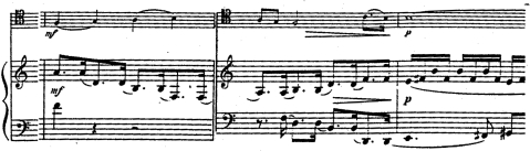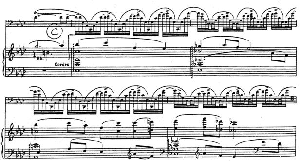 Légende's third section (beginning at m. 201) starts particularly effectively with a bucolic introductory arpeggio in the harp, leading to an oboe solo based on the whole-tone scale and highlighted by the theme's fall and rise of the tritone. Through a quasi-improvisation on the perfect fourth, which, by this time, had become one of Cras' stamps, the 'cellist leads (from measures 208-216 et seq.) into a highly contrapuntal developmental third section; this submotive he will then transform into the upbeat of the section's second broad, warm (Cras indicated chaud in his score), rhapsodic, transitional pentatonic theme: