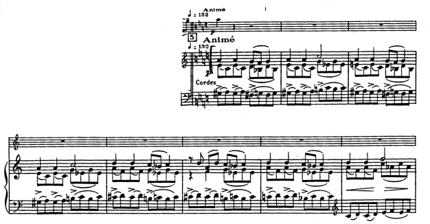 In the third movement, Cras brings the cyclical idiom to the rondo form (A-B-A-C-A-D-A-E-A). In E minor, it begins with a nervous yet jaunty rhythmic gesture, derived from the first movement's fourth thematic idea (measure 167 ff. of that movement). One will recognize once another budding Cras signature motive, Lombard rhythmic motives and their embellishments: