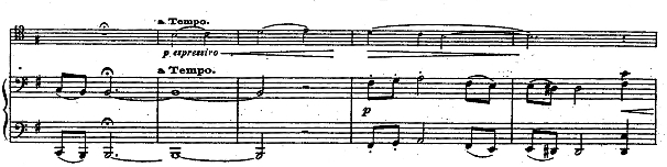 The second theme, in C major (measure 120), which Cras will recall in later movements, leads into a third motive at measures 146-147; this will recur prominently in the finale as its principal theme: