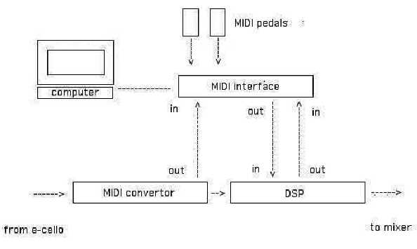 Whether performed on an acoustic cello that is amplified or on a true, non-acoustic electric cello, it is challenging and fun to perform the works in this article. The advantage to playing on an electric instrument is that the sound can be completely transformed (the sound not being heard coming from the instrument but from the speakers). I have used an Alesis Quadraverb, a Digitech Harmonizer, and a Jamman Digital Delay/Sampler for the past fifteen years as Multi Effects Processors. There are many new digital sound processors from which to choose. I began with a very simple setup that has grown into my traveling, interactive studio (see extensive setup diagram below). This article should help you decide your goals before you go shopping for new gear.