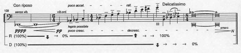 The electronic setup in Kaija Saariaho's Petals (1988) is very much the same as the above. The score is very clear about the electronics and even has a diagram for the setup. The MIDI pedal control is shown just below the cello part in the score. However, besides a MEP unit such as the Quadraverb you will also need a Harmonizer. One MIDI pedal will control the amount of reverberation from the Quadraverb and the other pedal will control the Harmonizer. The setting for the Harmonizer is a quartertone harmonization above and below the note played, creating a thick cluster of sound. When the two effects are combined in various ways a coloristic, at times thunderous, sound is achieved. The work is compositionally dynamic and sonically stunning and is highly recommended.