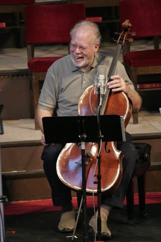 As I watched Harrell play, I could almost imagine him narrating to himself as he played, "Here's my stunningly perfect upper half martélé � Here's my machine-gun-like spiccato�." At one point Giora Schmidt was so taken aback by Harrell's sparkling spiccato that he lost his place in the rehearsal and the group had to re-start. At times Harrell seemed to be totally engrossed in having fun with his unparalleled bag of cellistic tricks.