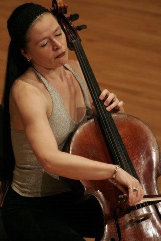 Shauna Rolston is quite a vivacious personality and this comes through in her playing, which is fiery and animated. Even when playing bass lines, she seems to imbue each note with meaning. She typically plays with one leg outstretched, as if trying to slide a dropped quarter back her way, and with her head thrust forward, as if making sure she doesn't miss a single nuance in the score or in her colleagues' performance. I found myself looking passed Zuill Bailey and Lynn Harrell as they played the Vivaldi Double in order to see what Rolston was doing with the tutti cello part. I wish my plane had arrived on time so that I could have heard her play the Shostakovich Sonata, which was "spine-tingling" according to one audience member. She is an extremely engaging performer.