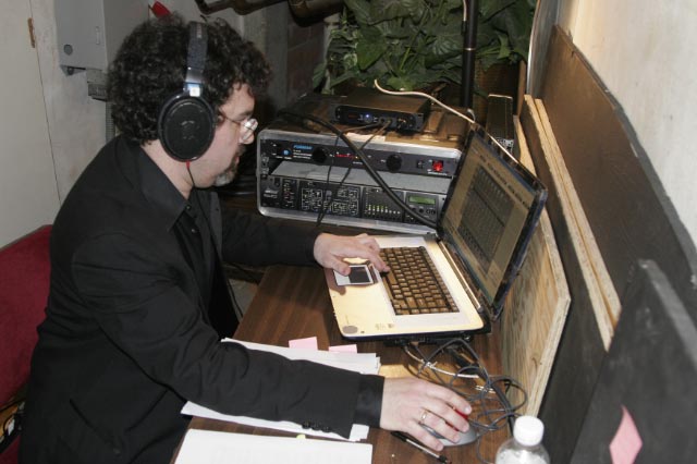 The life of a recording engineer is not easy. In addition to worrying about equipment failure, he must note precisely where each musician and microphone sits so that the sound is the same from session to session. This is important because he may made need to splice takes from different sessions when producing the recording that is ultimately released. He ensures this consistency by placing pieces of tape ("spikes") on the floor that mark the position of each chair and microphone. This system works beautifully as long as a helpful stagehand doesn't decide to clean up the spikes after a rehearsal, which happened the first day. Though outwardly calm, one could sense Abeshouse's inner heavy sighs as he did his best to recreate the original layout from memory.