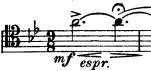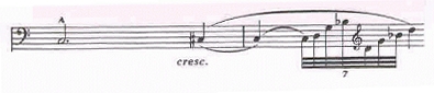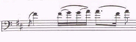 This same phenomenon occurs when bowing fast notes. Experiment with it in the famous arpeggio near the beginning of the Schumann concerto (see Example 3). If you try to play all of those notes loudly and with lots of bow, you will get a mess. Now try it by playing only the first few and the last note with intensity. The arpeggio still sounds loud, even though some notes aren't actually played loudly. Otherwise, as Piatigorsky used to say, you will "drown in your own sound."