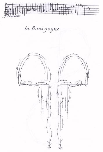 Today's Baroque dancers, like instrumentalists, struggle with the fact that there is no way of knowing for sure how people danced in the Baroque era. They can't pop in a video and watch dancers from the 1700's. They too have to rely on treatises that were written at that time. In addition to the usual sources that musicians rely upon -- C.P.E. Bach, Muffat, Rameau, etc. -- they have the good fortune of having rather detailed books that were written by Baroque dance masters, such as the one by Kellom Tomlinson, called The Art of Dancing, written in 1735. Rather florid descriptions of the various dance moves are provided in these books, in addition to diagrams of the various choreographies. See Example 1, which depicts a choreography of a courante. The steps are shown for a pair of dancers.