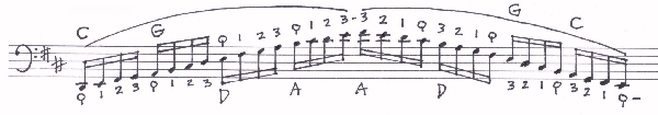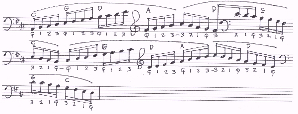 This same idea is used in fast playing, where you want to sound like you've got sixteen fingers, and you don't want anybody to discern your fingerings. The trick is to use fast, tiny finger movements without the use of any pressure to connect the positions. If the musical passage were played right after doing this exercise, the passage would sound perfectly clean, with no audible slides or shifts. This is the one thing that is common in all great virtuoso playing of string instruments; it sounds as if everything is being played in one position, even when going up and down the same string.