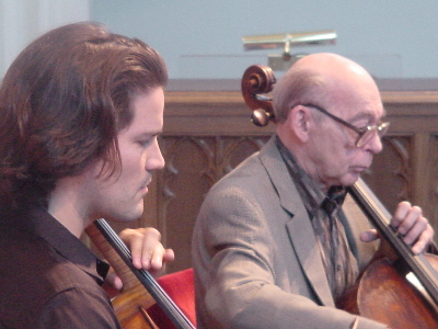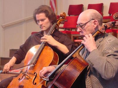 Given that Starker's performing career is now winding down, each of his concerts is an experience to be cherished. Bailey is very much aware of this and his driving mantra was, "This is historic � this is historic ... this is historic." He made sure that the entire event, including the rehearsals, was documented for posterity, though not necessarily for public release. He flew in Adam Abeshouse from New York, a Grammy Award winning audio engineer who has, among others, recorded pianist Garrick Olson and the Juilliard Quartet, and he hired a local video technician to film the concert. He also flew in fantastic musicians from New York, violinists Kurt Nikkanen and Soovin Kim and violist Kirsten Johnson. And because Starker no longer travels with his own instrument, Bailey had the 'Francesco' Gofriller flown in for Starker's use. (Interestingly, when Starker first tried the cello, he practiced double stop thirds and fifths in order to get to know it.) Bailey went to incredible lengths to make certain the concert was a success, and he spared nothing to ensure that Starker was treated like "The King of the Cello," as the advertisements for the concert said.