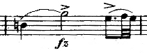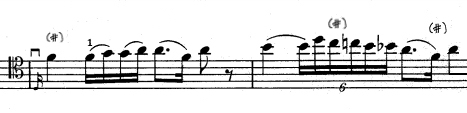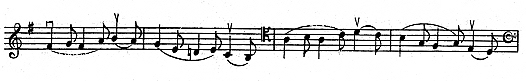 I also find that the placement of the bow can affect the execution of the shift, so I make sure that my bow is where I need it. For instance, in the Dvorak Concerto, when one shifts from B to G (see Example 2), the shift becomes more risky if you are too close to the tip and you shift too slowly. In this case, the bow has to be more concentrated and slow so that the shift occurs earlier in the bow stroke.