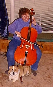 Even now that Kim is married and Melia is away at college, the house is still full. I have three Pembroke Welsh Corgis, a Labrador, and two cats. Dolly, my female corgi, sits under my chair when I practice the cello, although to be honest, she doesn't care who the cellist is; she just likes to sit under or very close to the cello. She prefers Bach above all other composers, and will sit with her ears laid back and her eyes half-closed, almost purring. She is terrified of the metronome, but I am trying to desensitize her to it by giving her dog cookies while it ticks. Dolly is the only one who is a real music lover. Abby, my rescue Lab, doesn't quite understand why she can't sit next to the cello like Dolly does, but being poked a few times with the bow usually convinces her to move. Luka, chews placidly on one of those plastic bones that most dogs won't touch, and Merlin waits until I'm practicing to jump on the sofa or bark to annoy me.