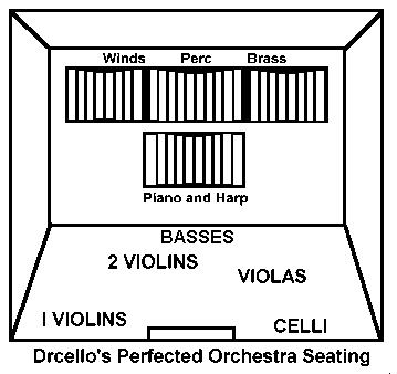 In an altruistic effort to finally straighten things out, webmaster has devised the "Perfected Orchestral Seating Arrangement," which meets the needs of all instrumentalists and conductors, and which could usher in a new era of orchestral joy and harmony, if only we can get enough conductors to adopt it. webmaster is confident that the best orchestras will soon be using this arrangement, since it is obviously superior. Here is a diagram and an explanation. Please feel free to print this and distribute it widely.